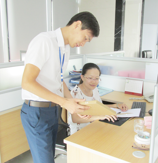 圖為員工在探討如何創(chuàng)新服務(wù),更好地服務(wù)客戶。