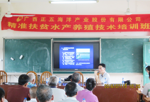 7月15日,農(nóng)業(yè)產(chǎn)業(yè)化重點龍頭企業(yè)正五海產(chǎn)公司聯(lián)合市農(nóng)業(yè)局和水產(chǎn)畜牧獸醫(yī)局,來到銀海區(qū)四條貧困村之一的福成鎮(zhèn)大坎村舉辦“精準扶貧水產(chǎn)養(yǎng)殖技術(shù)培訓(xùn)班”。來自大坎村委的貧困戶及水產(chǎn)養(yǎng)殖戶踴躍參加了培訓(xùn)。