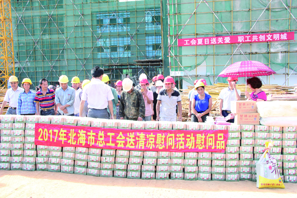 炎炎烈日,創(chuàng)新港項目施工現(xiàn)場的工人們,揮汗如雨地堅持露天作業(yè),工人們的防暑降溫工作,牽動著北海市總工會領(lǐng)導(dǎo)的心。8月7日下午,北海市總工會經(jīng)審會主任潘能強(qiáng)、高新區(qū)管委會副主任梁小雄等領(lǐng)導(dǎo)一行,前往北部灣海洋科技創(chuàng)新港建設(shè)工地,開展“工會夏日送關(guān)愛·職工共創(chuàng)文明城”主題活動,看望和慰問酷暑期間還堅持奮戰(zhàn)在建設(shè)第一線的工人,為他們送去了絲絲清涼和關(guān)心。
