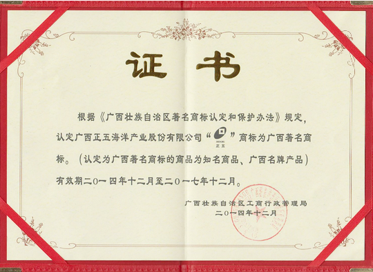 經(jīng)廣西著名商標評審委員會評審確認,廣西壯族自治區(qū)工商局同意,正五海產(chǎn)公司注冊商標“ZHENCWU正五”被認定為廣西著名商標,并于日前獲得了自治區(qū)工商局頒發(fā)的廣西著名商標證書。